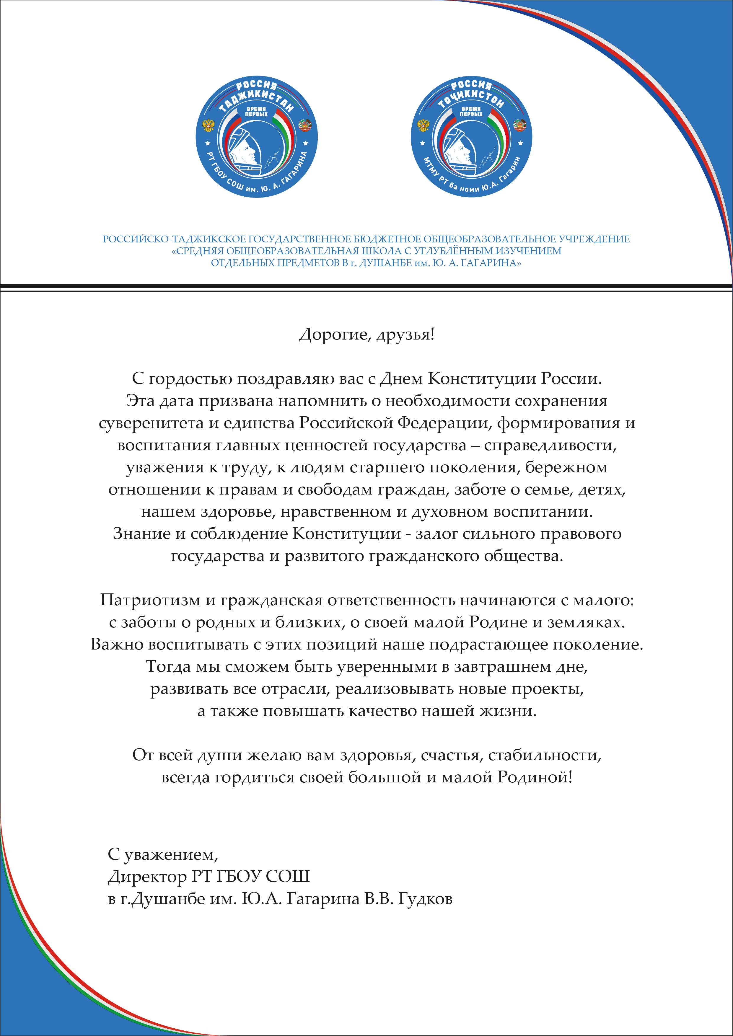 Поздравление директора школы имени Гагарина Владимира Гудкова
