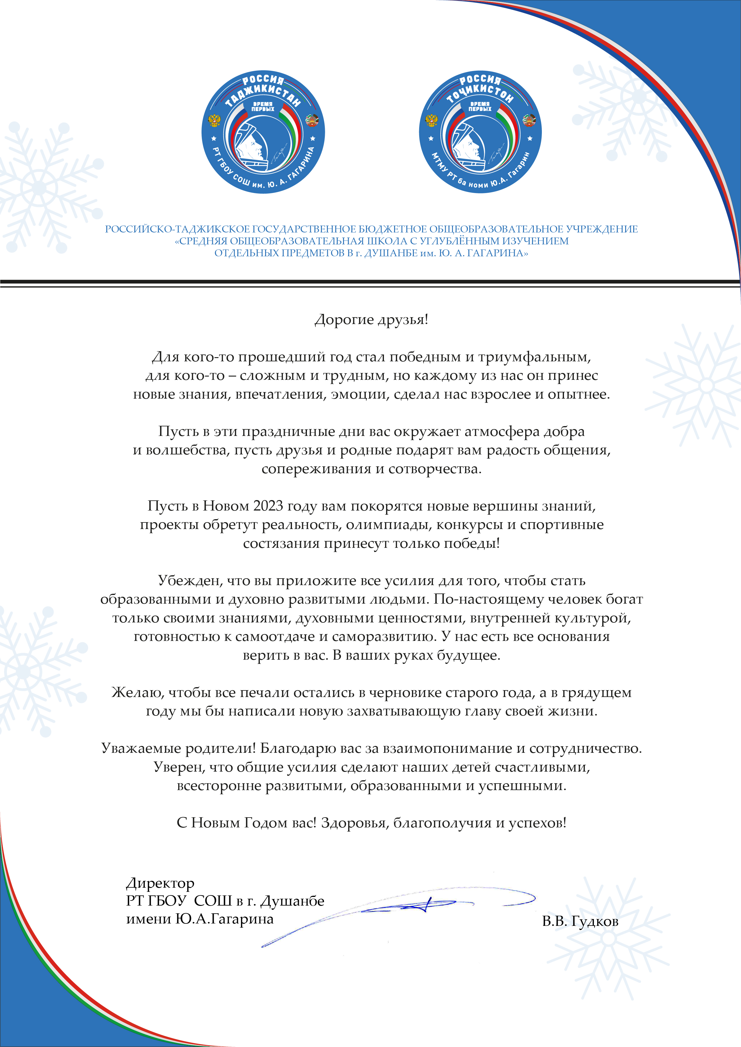 Поздравление директора школы имени Ю.А. Гагарина