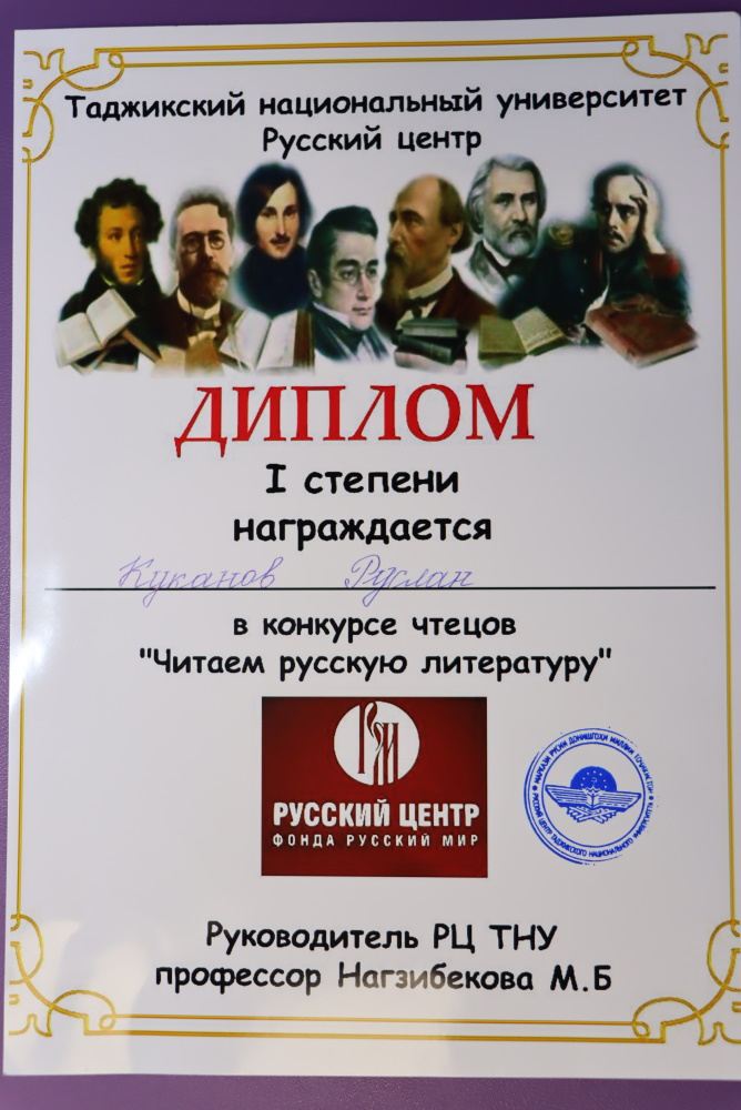 Руслан Куканов награжден Дипломом 1 степени Русского центра в конкурсе чтецов «Читаем русскую литературу» на базе Таджикского национального университета.