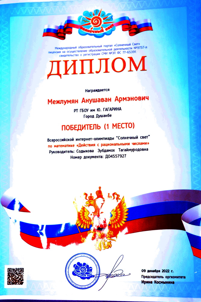 Анушаван Межлумян занял 1 место во Всероссийской интернет-олимпиаде «Солнечный свет» по математике «Действие с рациональными числами».
