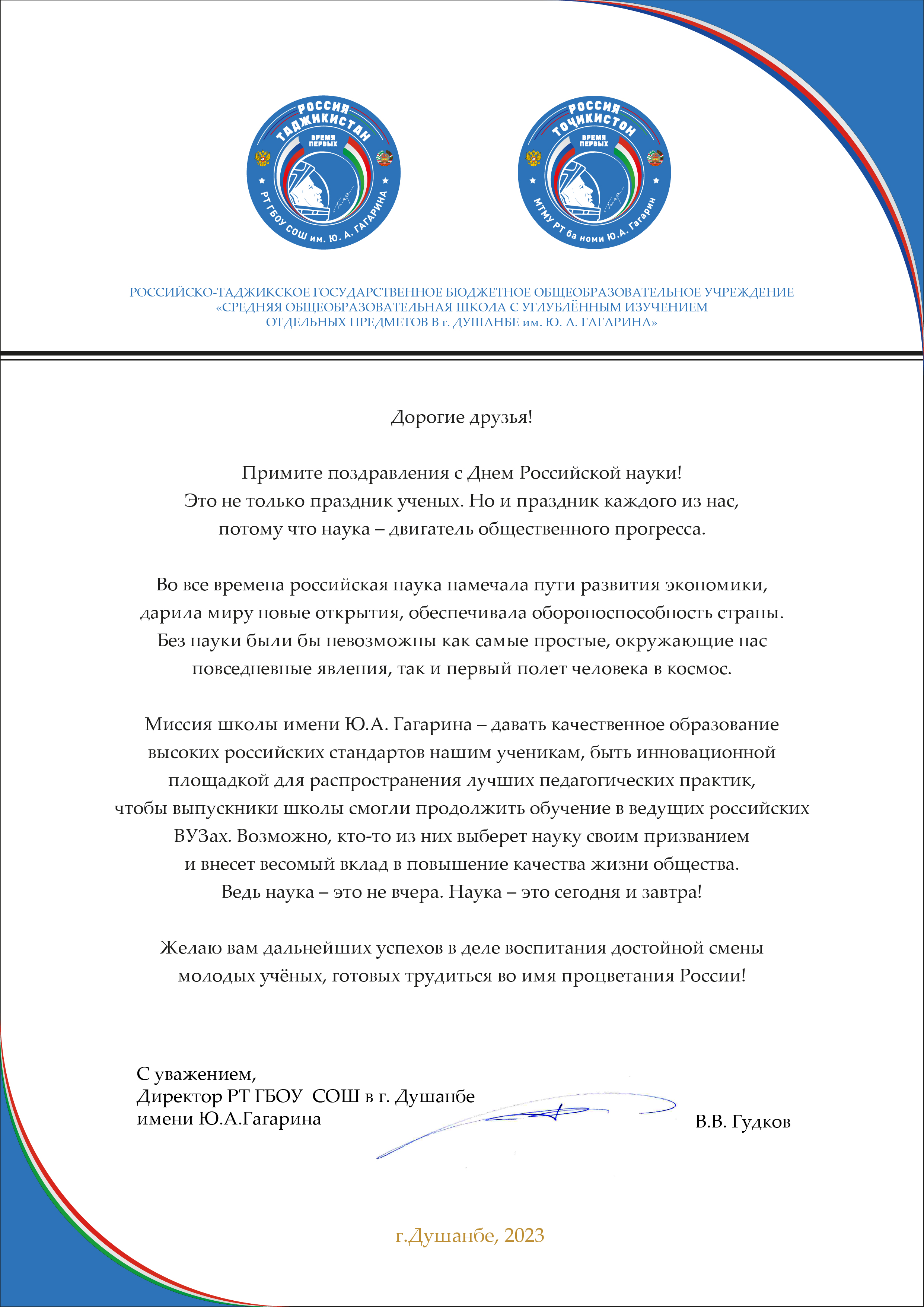 Поздравление директора СОШ имени Ю.А.Гагарина
