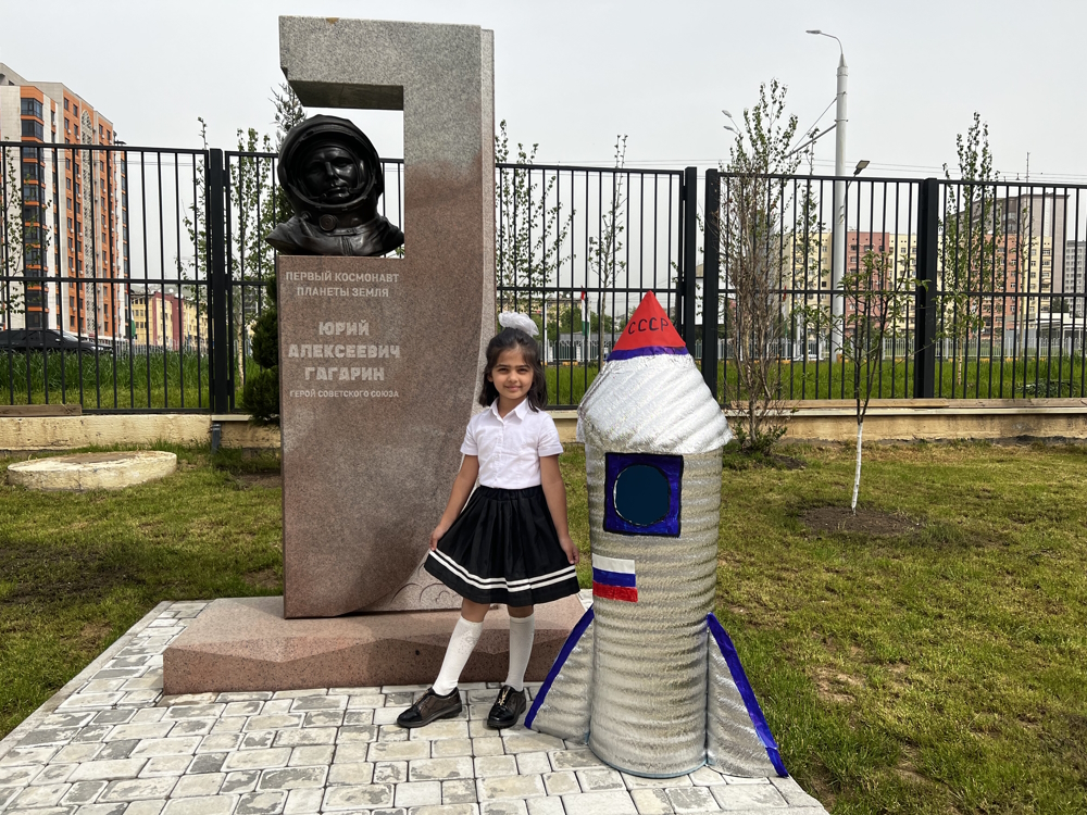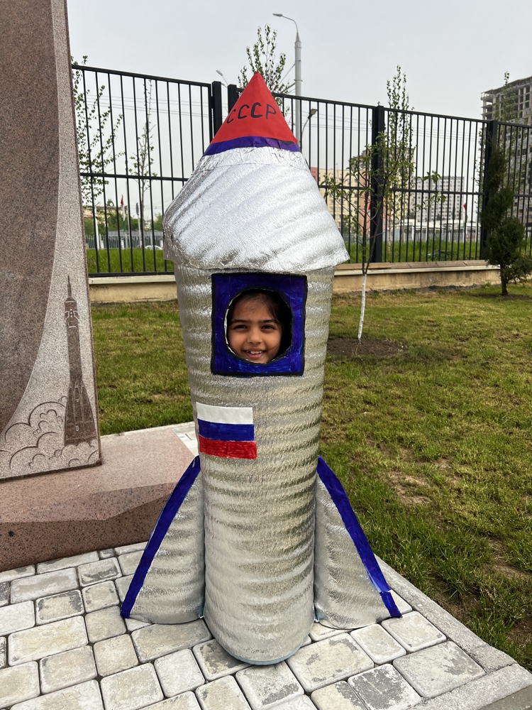 Все свои победы на олимпиадах и в конкурсах ребята посвятили Дню Космонавтики. Ну а Амина Иброхимзода, мечтая полететь в космос, смастерила огромный макет ракеты, который стал самым крупным экспонатом школьной выставки «Космос – это мы». Амина легко помещается в своей ракете и в этот момент представляет себя «космонавтом в невесомости».