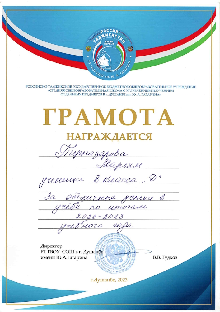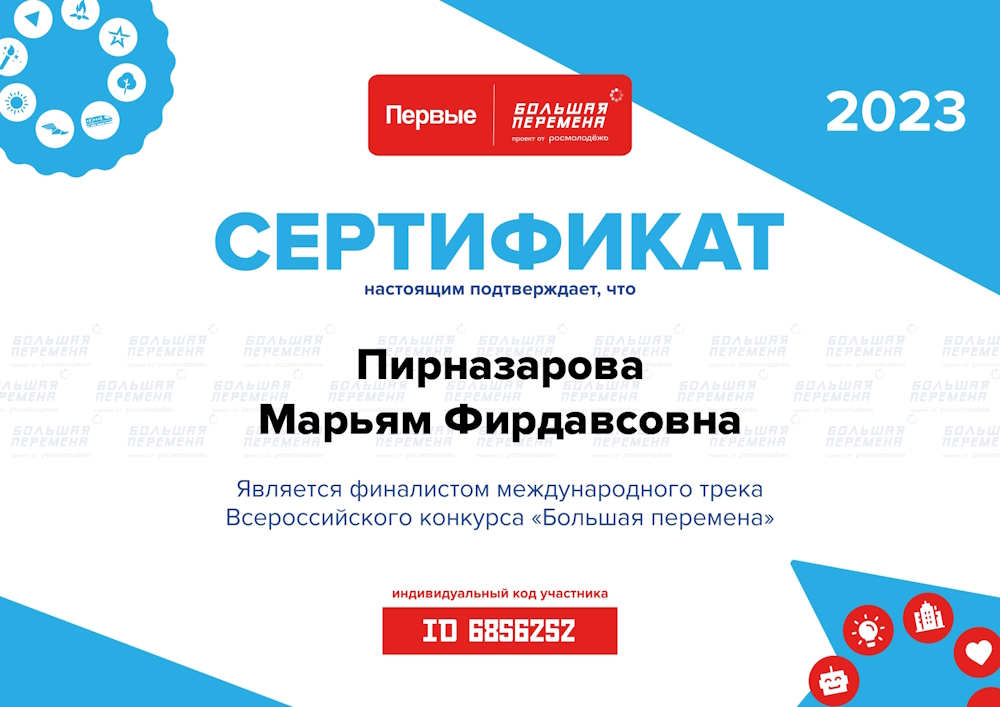 Напомним, цель Всероссийского конкурса «Большая перемена» – дать возможность каждому подростку проявить себя и найти свои сильные стороны. В минувшем учебном году в конкурсе принимали участие и ребята из зарубежных стран. И сразу два ученика школы имени Ю.А. Гагарина стали его финалистами. Сегодня мы представили вам Марьям Пирназарову. А в одной из следующих публикаций вас ждет встреча с победителем международного трека Конкурса Дониёром Саидовым.