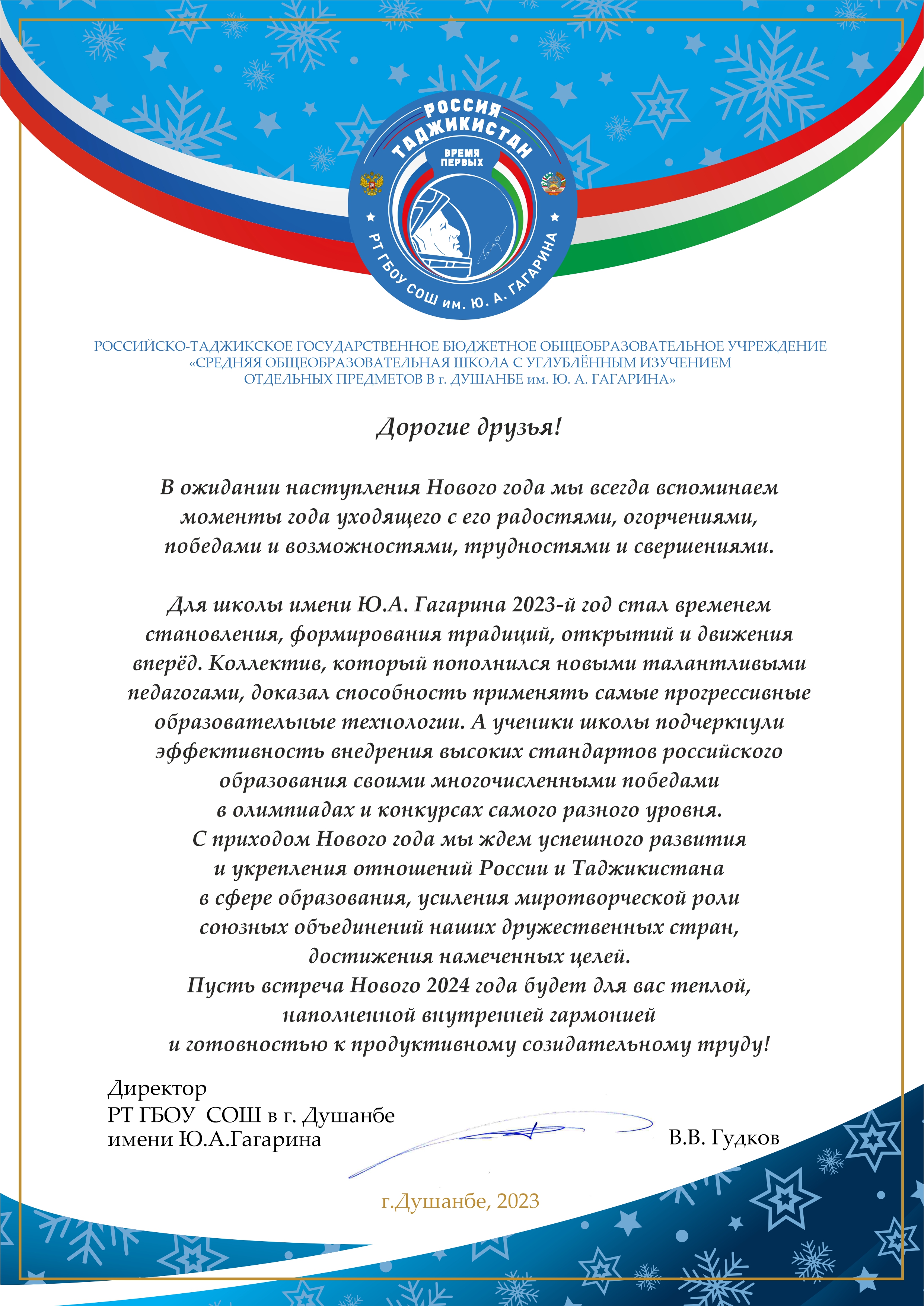 С наступающим Новым годом поздравляет директор школы имени Ю.А. Гагарина Владимир Гудков.