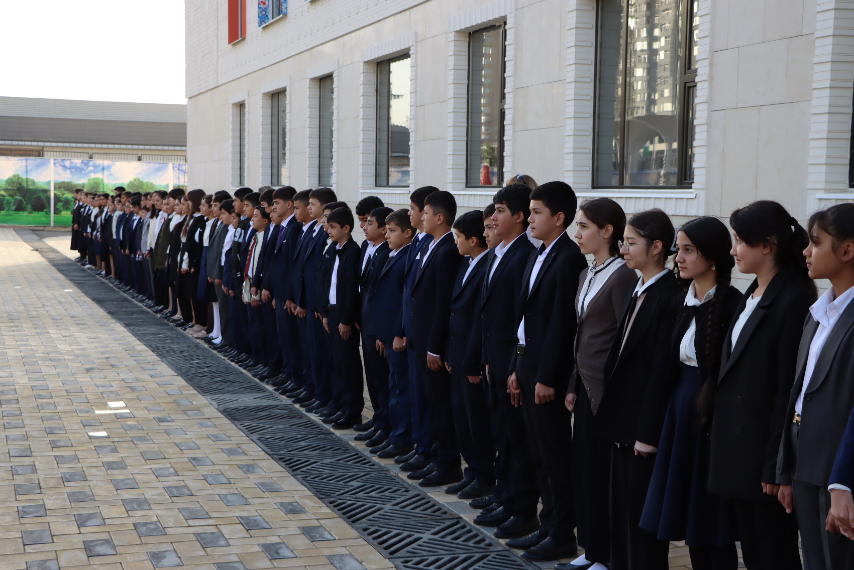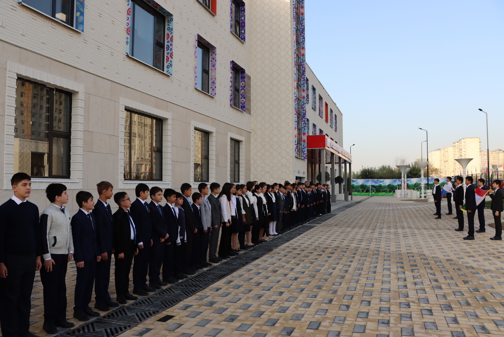 В торжественной церемонии приняли участие ученики средних классов и знаменные группы школы, созданные из числа участников военно-патриотического объединения, активистов. Команду отдал директор школы Владимир Гудков. Под гимны двух государств флаги подняли на флагштоки, установленные у центрального входа в учебное заведение.