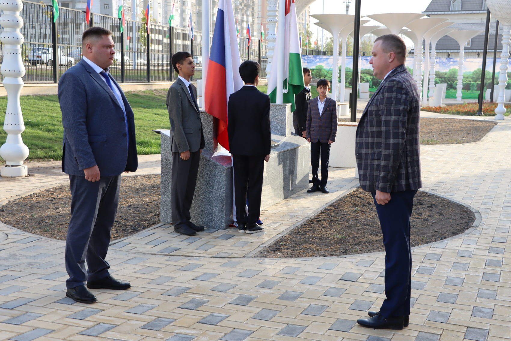 Очередная учебная неделя в школе имени Гагарина началась с поднятия флагов Российской Федерации и Республики Таджикистан.
