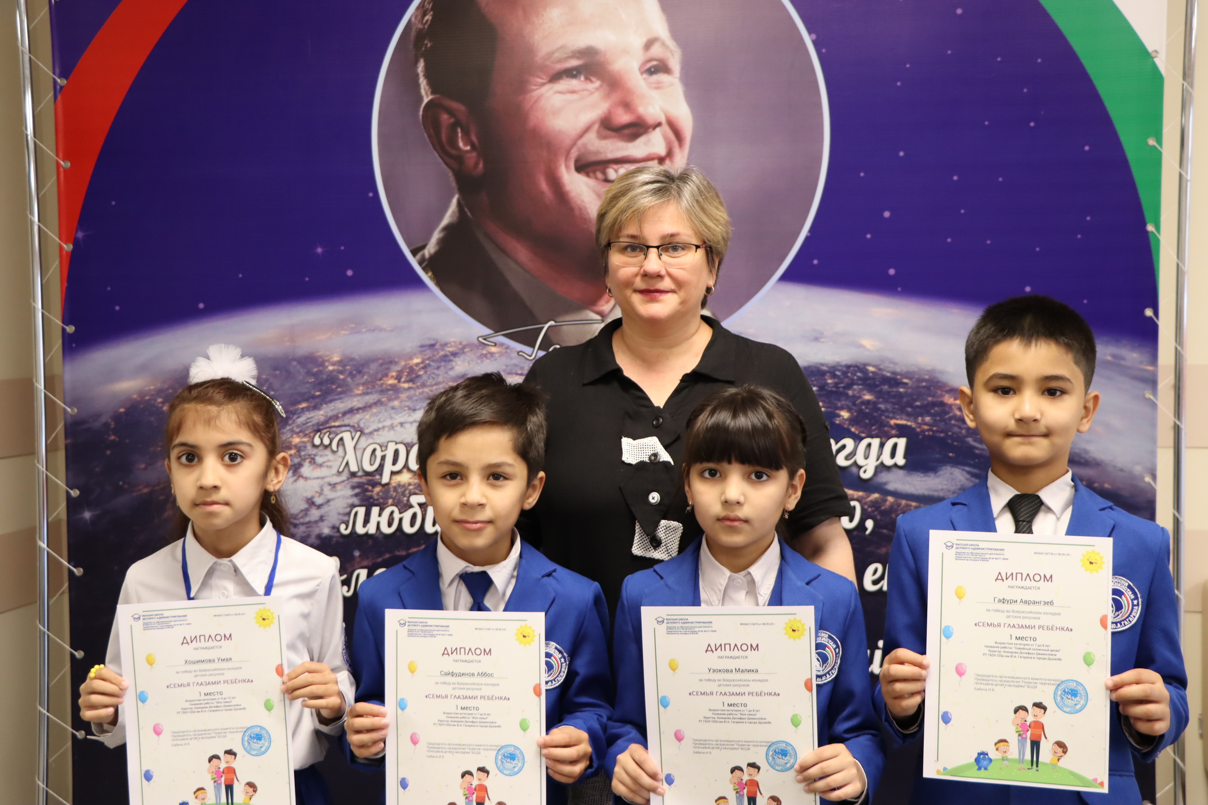 Нашу школу на конкурсе представляют учитель русского языка и литературы Оксана Фёдоровна Мурзинцева и ученицы 9 А класса Озодабону Нурматова и Шукрона Диловаршоева.