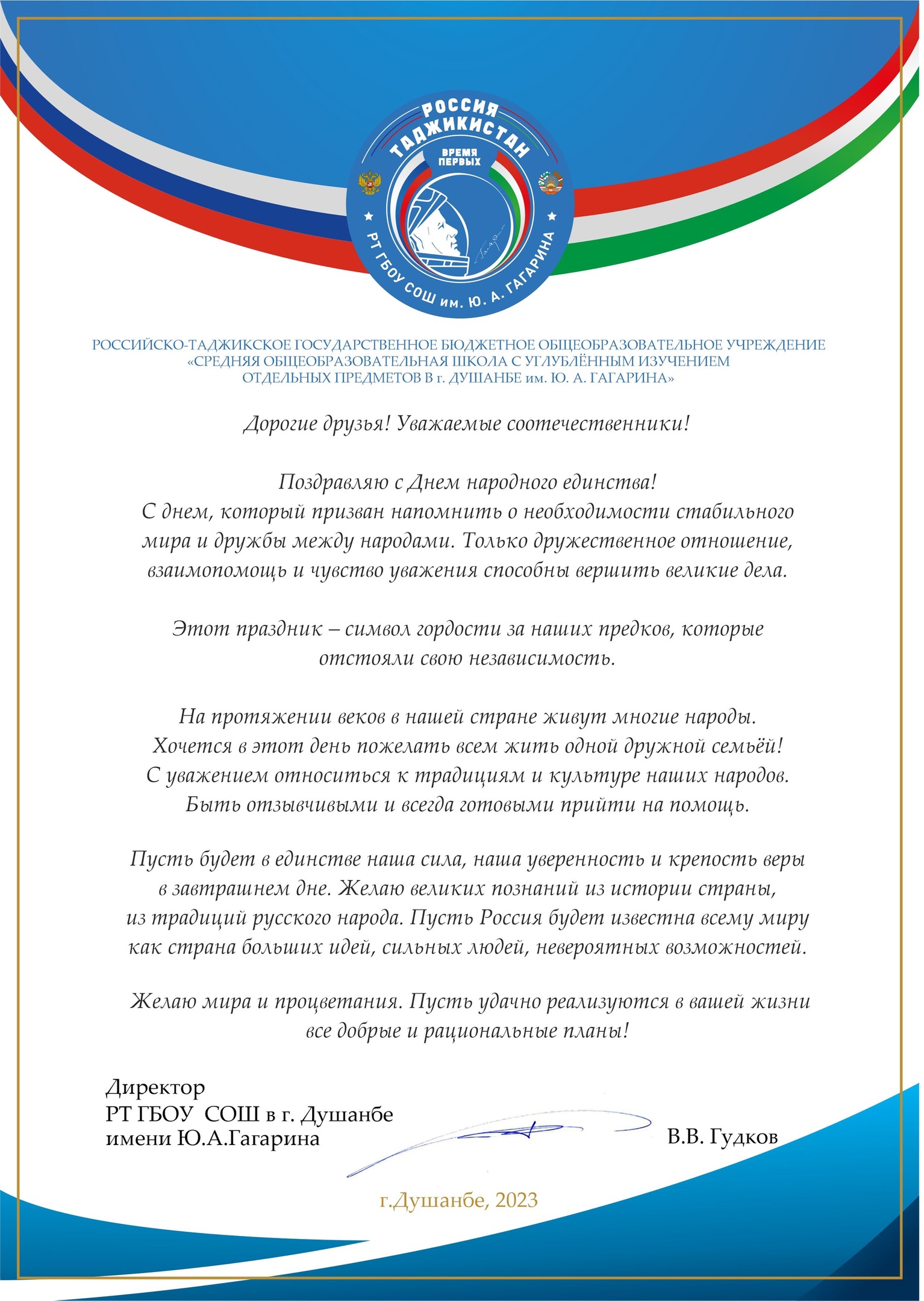 Директор школы имени Ю.А. Гагарина Владимир Гудков поздравляет с Днем народного единства.