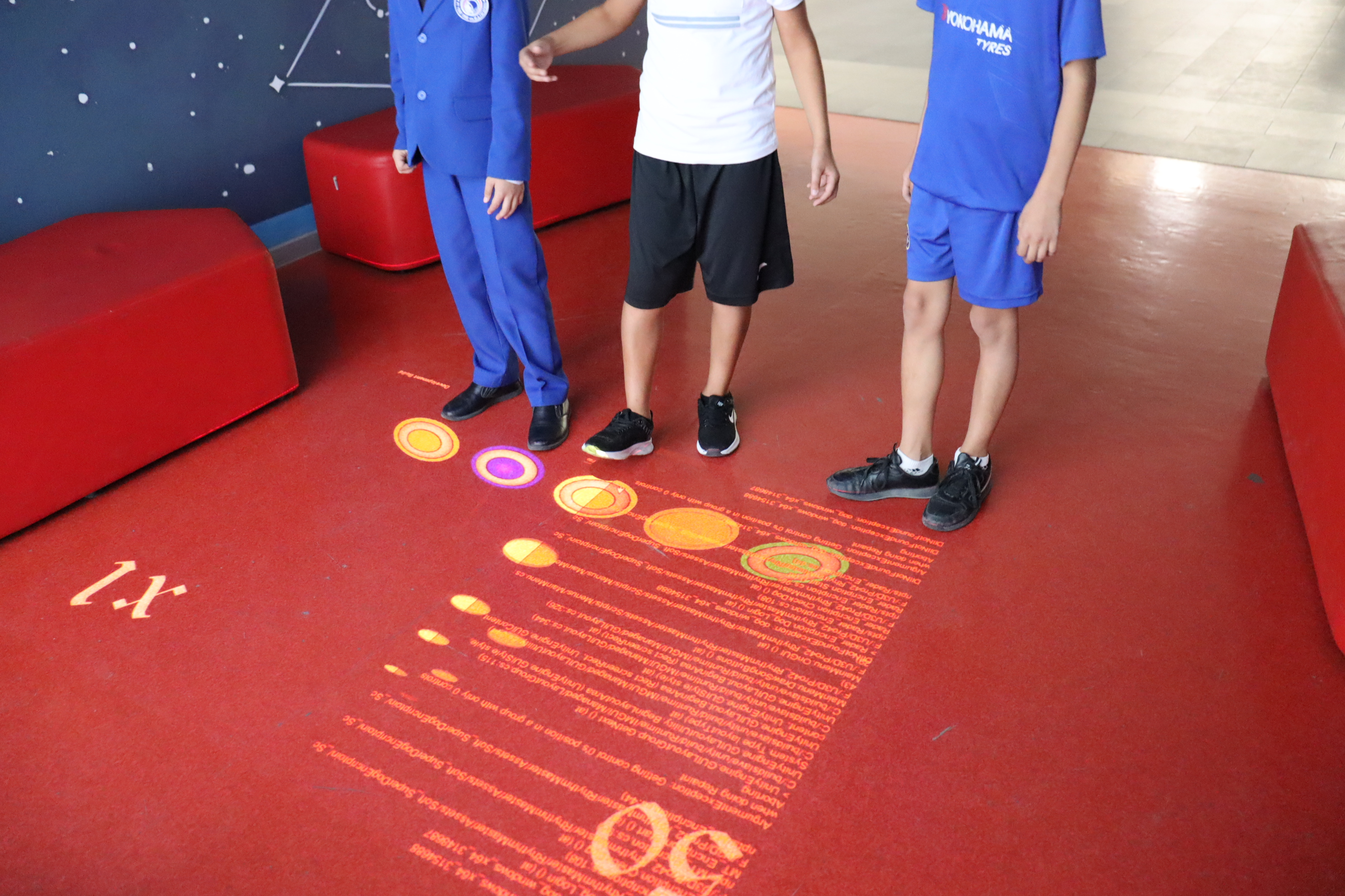 Учитель информатики Маъруфджон Акбарович изготовил прибор для проекции и подключил в зоне отдыха интерактивный пол – это напольная проекция, которая реагирует на движения людей. Попадая в зону проекции, ученик своими действиями заставляет картинку «оживать». Комплекс состоит из компьютера, проектора, датчиков движения, камеры и программного обеспечения.