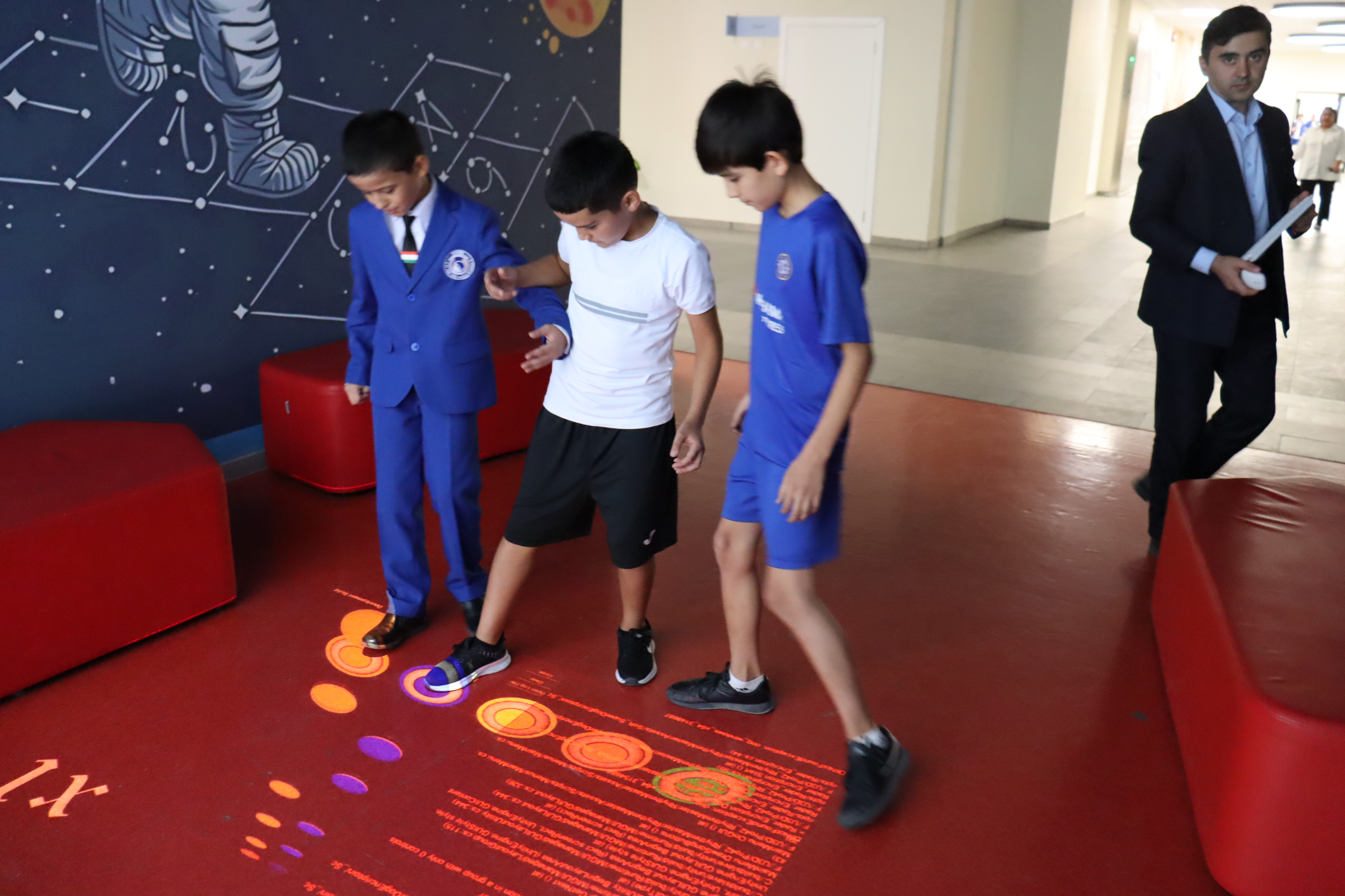 Учитель информатики Маьруфджон Акбарович изготовил прибор для проекции и подключил в зоне отдыха интерактивный пол – это напольная проекция, которая реагирует на движения людей. Попадая в зону проекции, ученик своими действиями заставляет картинку «оживать». Комплекс состоит из компьютера, проектора, датчиков движения, камеры и программного обеспечения.