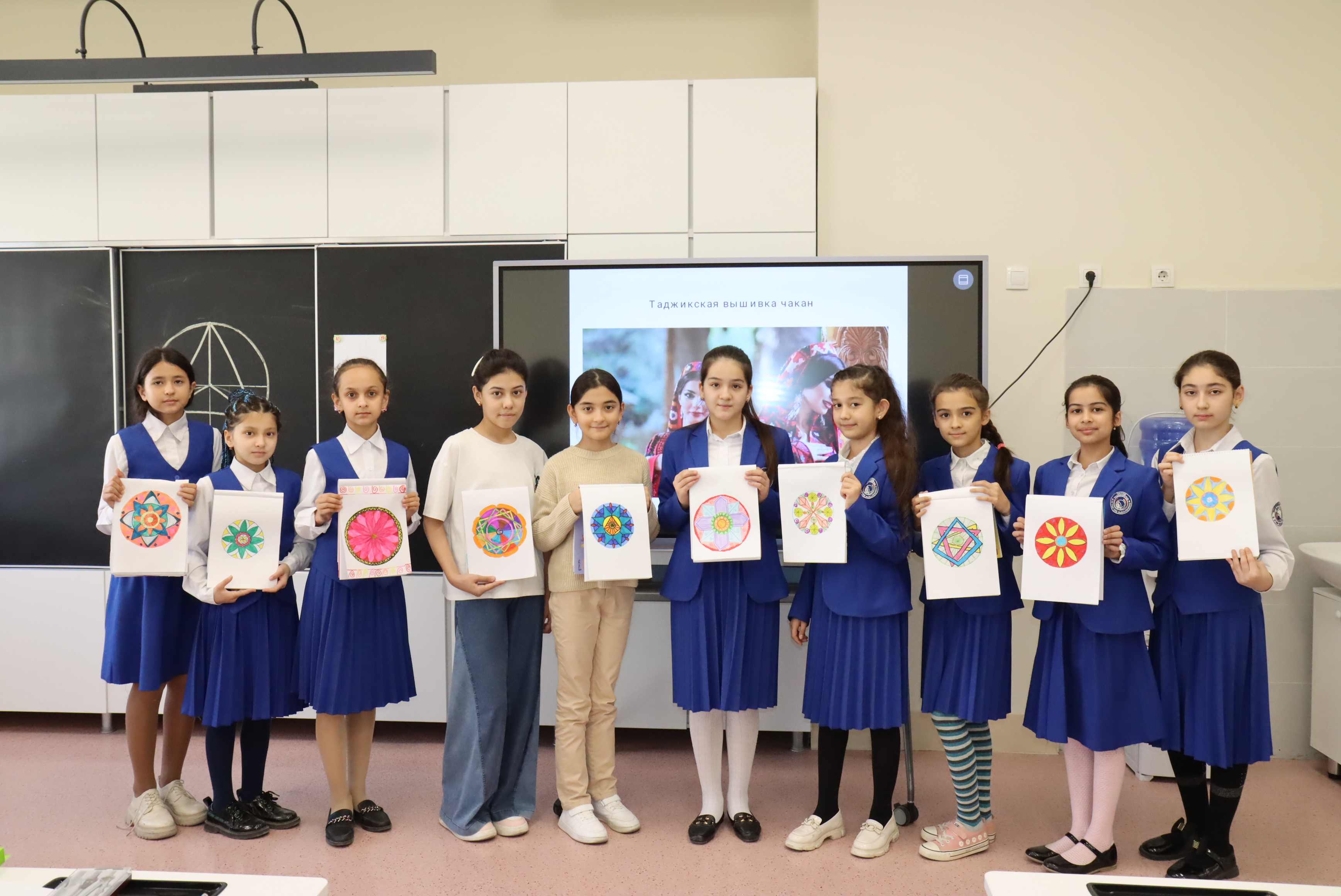 Ребята познакомились с таджикской вышивкой чакан, научились работать с окружностью, делить его на равные части. Чакан внесена во Всемирный репрезентативный список нематериального культурного наследия человечества ЮНЕСКО.