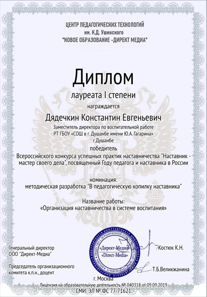 Заместитель директора по воспитательной работе школы имени Гагарина в г. Душанбе стал победителем Всероссийского конкурса успешных практик наставничества «Наставник – мастер своего дела», посвященный Году педагога и наставника в России.